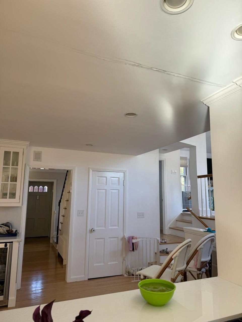 This project focused on a ceiling water damage repair within a kitchen and living area. Initially, our team identified and removed compromised drywall sections to prevent mold growth. Subsequently, we installed new gypsum boards and taped them to create a seamless surface. Once we sanded and primed the ceiling water damage repair, we applied high-quality paint. Consequently, the space returned to its original condition and blended perfectly with the existing architecture.